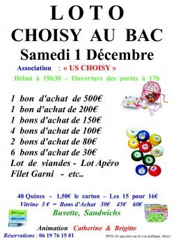 L'USCB organise un LOTO le samedi 1er décembre. à 19h30 (ouverture des portes à 17h00) dans la salle polyvalente de Choisy-au-Bac.
